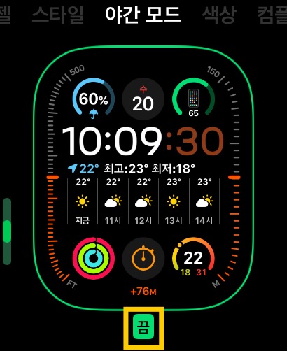 우연인지 상단에 야간 모드 라고 메뉴가 있는 것을 확인했다. 그리고 디지털크라운 을 돌려주니